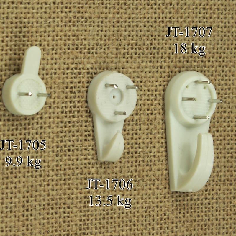 Данные крючки вбиваются в стену молотком, забивая маленькие штырьки насквозь пластмассового основования. Чем более рыхлое основание, тем хуже данный крючок держится.